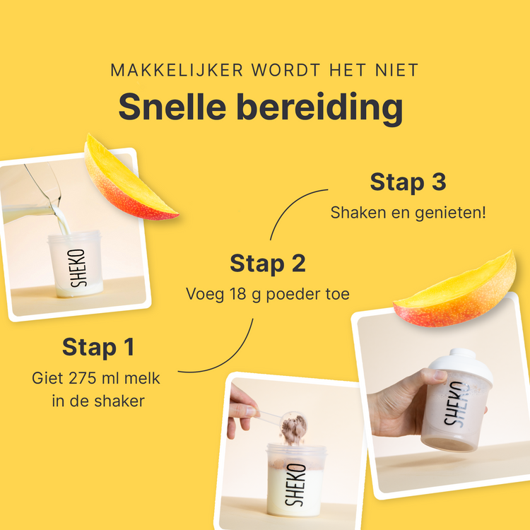 Je shake is klaar in slechts drie stappen: Giet 275 ml melk (1,5% vet) in de shaker. Voeg 18 g poeder toe (ca. 2 opscheplepels of 2 afgestreken maatlepels). Schud alles goed door. Klaar om te genieten!