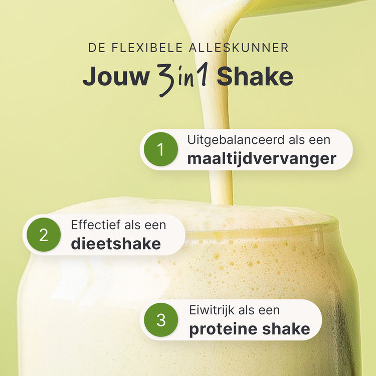 *De voedingswaarden zijn berekend met de vanillesmaak als voorbeeld. Let op: de shake is alleen een complete maaltijdvervanger met koemelk.