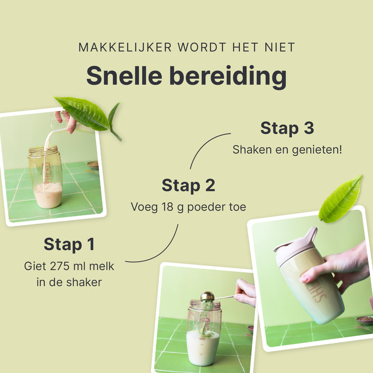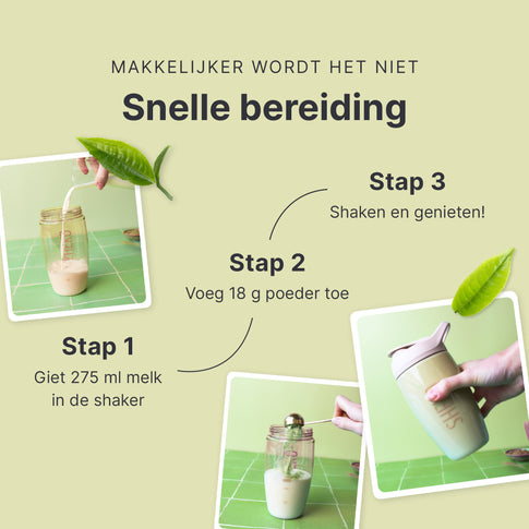 Je shake is klaar in slechts drie stappen: Giet 275 ml melk (1,5% vet) in de shaker. Voeg 18 g poeder toe (ca. 2 opscheplepels of 2 afgestreken maatlepels). Schud alles goed door. Klaar om te genieten!