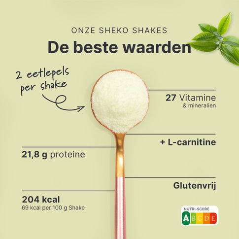 Wat je moet wetenHet vervangen van twee van je dagelijkse hoofdmaaltijden door een SHEKO shake draagt bij aan gewichtsverlies als onderdeel van een caloriearm dieet. Het vervangen van één maaltijd per... Het vervangen van twee van je dagelijkse hoofdmaaltijden door een SHEKO shake draagt bij aan gewichtsverlies als onderdeel van een caloriearm dieet. Het vervangen van één maaltijd per dag helpt je om op gewicht te blijven. De SHEKO shake werkt alleen gewichtsbeheersend als onderdeel van een caloriearm, gevarieerd en uitgebalanceerd dieet. Het is daarom belangrijk dat je ook andere voedingsmiddelen eet en de bereidingswijze volgt. Zorg voor een gezonde levensstijl en drink dagelijks voldoende water of ongezoete thee.