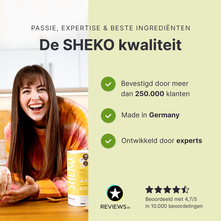 Als onderdeel van een caloriearm dieet draagt het vervangen van twee van de dagelijkse hoofdmaaltijden door een SHEKO Shake bij aan gewichtsverlies, en het vervangen van één hoofdmaaltijd per dag draagt bij aan het behouden van je gewicht. De SHEKO Shake vervult het doel van gewichtscontrole alleen in het kader van een caloriearm dieet en als je ook andere voedingsmiddelen tot je neemt. Zorg voor een gevarieerd en uitgebalanceerd dieet en een gezonde levensstijl. Het is belangrijk dat je dagelijks voldoende water of ongezoete thee drinkt.