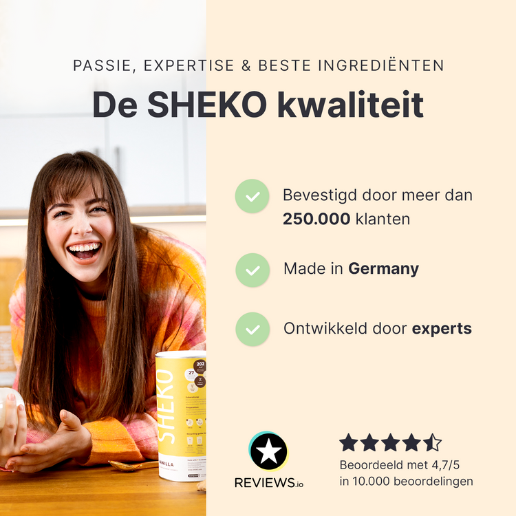 De SHEKO shake werkt alleen gewichtsbeheersend als onderdeel van een caloriearm, gevarieerd en uitgebalanceerd dieet. Het is daarom belangrijk dat je ook andere voedingsmiddelen eet en de bereidingswijze volgt. Zorg voor een gezonde levensstijl en drink dagelijks voldoende water of ongezoete thee.