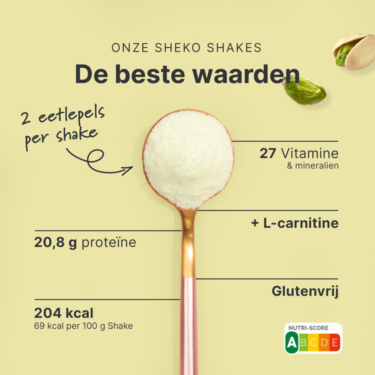 Als onderdeel van een caloriearm dieet draagt het vervangen van twee van de dagelijkse hoofdmaaltijden door een SHEKO Shake bij aan gewichtsverlies, en het vervangen van één hoofdmaaltijd per dag draagt bij aan het behouden van je gewicht. De SHEKO Shake vervult het doel van gewichtscontrole alleen in het kader van een caloriearm dieet en als je ook andere voedingsmiddelen tot je neemt. Zorg voor een gevarieerd en uitgebalanceerd dieet en een gezonde levensstijl. Het is belangrijk dat je dagelijks voldoende water of ongezoete thee drinkt.