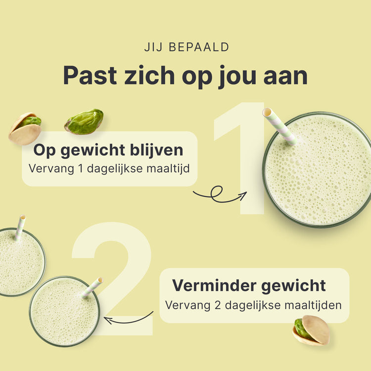 Als je je 'feel good'-gewicht wilt behouden, vervang dan 1 maaltijd per dag door onze shake. Of het nu ontbijt, lunch of diner is.