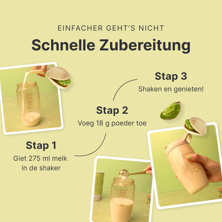 Je shake is klaar in slechts drie stappen: Giet 275 ml melk (1,5% vet) in de shaker. Voeg 18 g poeder toe (ca. 2 opscheplepels of 2 afgestreken maatlepels). Schud alles goed door. Klaar om te genieten!