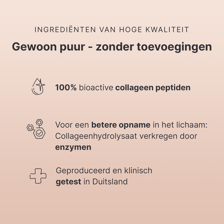 Nicht jedes Kollagen ist gleich! Hydrolysiertes Kollagen wird in einem zusätzlichen Verarbeitungsschritt so aufbereitet, dass es vom Körper besonders gut aufgenommen und verwertet werden kann. Unsere Kollagen-Peptide entstehen durch eine enzymatische Hydrolyse, welche die Moleküle in eine besonders kleine, bioaktive Form bringt. Das Ergebnis? Eine optimale zellstimulierende Wirkung – wissenschaftlich bestätigt und klinisch getestet. Wir setzen ausschließlich auf hochwertige Markenrohstoffe, produzieren in Deutschland und führen regelmäßige Qualitätskontrollen durch, um höchste Standards zu gewährleisten.