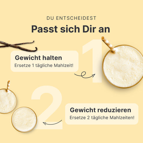 Gewicht haltenWenn Du Dein Wohlgefühlgewicht halten möchtest, ersetze 1 Mahlzeit am Tag mit unserem Shake. Egal ob Frühstück, Mittag oder Abendessen.