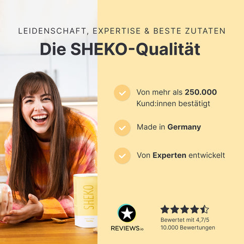 Was Du beachten solltestDas Ersetzen von zwei der täglichen Hauptmahlzeiten durch je einen SHEKO Shake trägt zur Gewichtsabnahme im Rahmen einer kalorienarmen Ernährung bei. Das Ersetzen einer täglichen Mahlzeit hilft Dir, Dein... Das Ersetzen von zwei der täglichen Hauptmahlzeiten durch je einen SHEKO Shake trägt zur Gewichtsabnahme im Rahmen einer kalorienarmen Ernährung bei. Das Ersetzen einer täglichen Mahlzeit hilft Dir, Dein Gewicht zu halten. Der SHEKO Shake erfüllt den gewichtskontrollierenden Zweck nur im Rahmen einer kalorienarmen, abwechslungsreichen und ausgewogen Ernährung. Dafür ist es wichtig, dass Du auch andere Lebensmittel zu Dir nimmst, sowie die Angaben zur Zubereitung einhältst. Achte dabei auf eine gesunde Lebensweise und, dass Du täglich genügend Wasser oder ungesüßten Tee zu Dir nimmst.