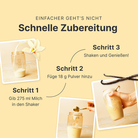 Dein Shake ist in nur drei Schritten fertig: Gib 275 ml Milch (1,5 % Fett) in den Shaker. Füge 18 g Pulver (ca. 2 gehäufte EL oder 2 gestrichene Messlöffel) hinzu. Schüttle alles gut durch. Fertig zum Genießen!