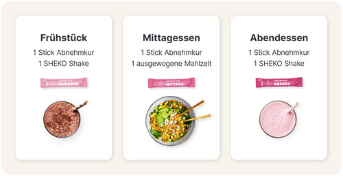 Im Rahmen einer kalorienarmen Ernährung trägt das Ersetzen von zwei der täglichen Hauptmahlzeiten durch je einen SHEKO Shake zur Gewichtsabnahme bei und das Ersetzen von einer Hauptmahlzeit täglich trägt dazu bei, Dein Gewicht anschließend zu halten. Der SHEKO Shake erfüllt den gewichtskontrollierenden Zweck nur im Rahmen einer kalorienarmen Ernährung und wenn Du auch andere Lebensmittel zu Dir nimmst. Achte dabei auf eine abwechslungsreiche und ausgewogene Ernährung sowie eine gesunde Lebensweise. Dabei ist es wichtig, dass Du täglich genügend Wasser oder ungesüßten Tee zu Dir nimmst.