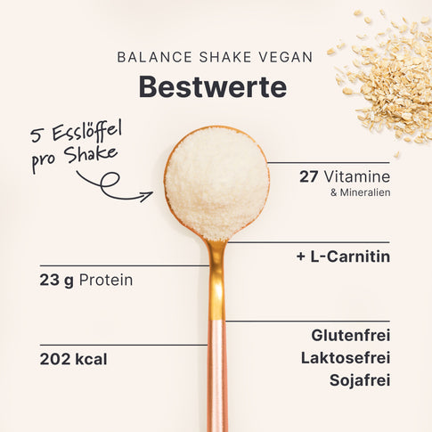 Beim veganen Balance Shake wurden die Nährwerte mit 300 ml Wasser berechnet, so wie es in der Standardzubereitung empfohlen wird. Wenn Du stattdessen einen Pflanzendrink wie Hafer- oder Mandeldrink verwendest, kann sich der Kaloriengehalt leicht verändern, je nachdem, welche Sorte Du wählst. Tipp: Für eine ausgewogene Nährstoffbilanz empfehlen wir ungesüßte Pflanzendrinks.