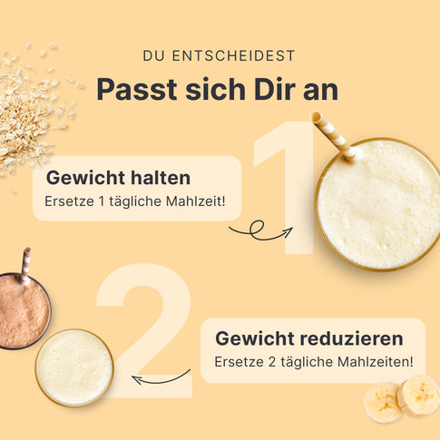 Sobald Du Dein Zielgewicht erreicht hast, kannst Du Dein Gewicht mit einer Übergangsphase von 1 Shake täglich halten und den Jojo-Effekt vermeiden.