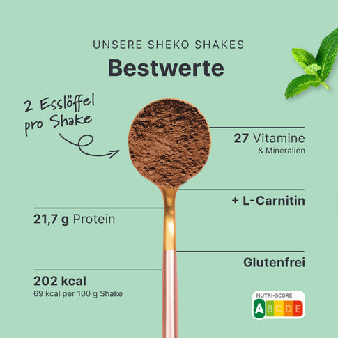 Das Ersetzen von zwei der täglichen Hauptmahlzeiten durch je einen SHEKO Shake trägt zur Gewichtsabnahme im Rahmen einer kalorienarmen Ernährung bei. Das Ersetzen einer täglichen Mahlzeit hilft Dir, Dein Gewicht zu halten.