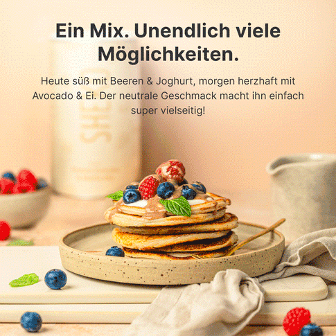 Der neutrale Geschmack macht die Mischung besonders vielseitig. Magst Du Deine Pancakes oder Waffeln lieber süß oder herzhaft? Du hast die Wahl! Kombiniere sie mit Deinen Lieblings-Toppings: Zum Beispiel süß mit Beeren, Joghurt und Nussmus oder herzhaft mit Avocado, Ei oder Käse. Eine Basis, unendlich viele Möglichkeiten.