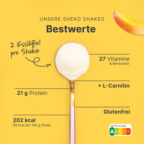 Der SHEKO Shake erfüllt den gewichtskontrollierenden Zweck nur im Rahmen einer kalorienarmen, abwechslungsreichen und ausgewogen Ernährung. Dafür ist es wichtig, dass Du auch andere Lebensmittel zu Dir nimmst, sowie die Angaben zur Zubereitung einhältst. Achte dabei auf eine gesunde Lebensweise und, dass Du täglich genügend Wasser oder ungesüßten Tee zu Dir nimmst.