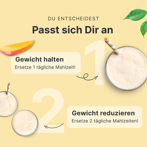 Wenn Du Dein Wohlgefühlgewicht halten möchtest, ersetze 1 Mahlzeit am Tag mit unserem Shake. Egal ob Frühstück, Mittag oder Abendessen.