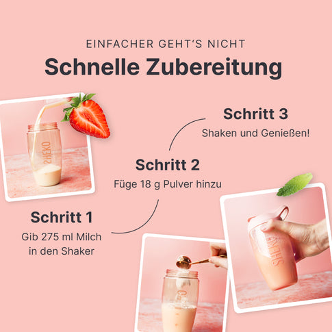 Dein Shake ist in nur drei Schritten fertig: Gib 275 ml Milch (1,5 % Fett) in den Shaker. Füge 18 g Pulver (ca. 2 gehäufte EL oder 2 gestrichene Messlöffel) hinzu. Schüttle alles gut durch. Fertig zum Genießen!