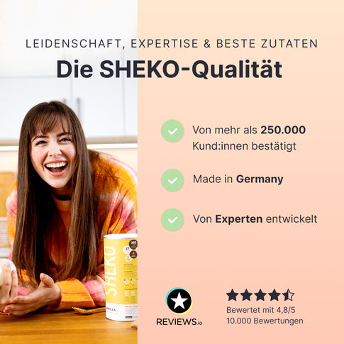 Unser SHEKO Multi Kollagen wird in Deutschland hergestellt, regelmäßig laborgeprüft und kommt ganz ohne Zuckerzusatz, Füllstoffe oder künstliche Zusätze aus. Dabei ist es komplett geschmacks- und geruchsneutral und löst sich klumpenfrei in jeder Flüssigkeit auf.