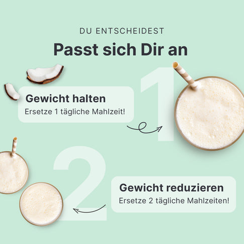 Das Ersetzen von zwei der täglichen Hauptmahlzeiten durch je einen SHEKO Shake trägt zur Gewichtsabnahme im Rahmen einer kalorienarmen Ernährung bei. Das Ersetzen einer täglichen Mahlzeit hilft Dir, Dein Gewicht zu halten.