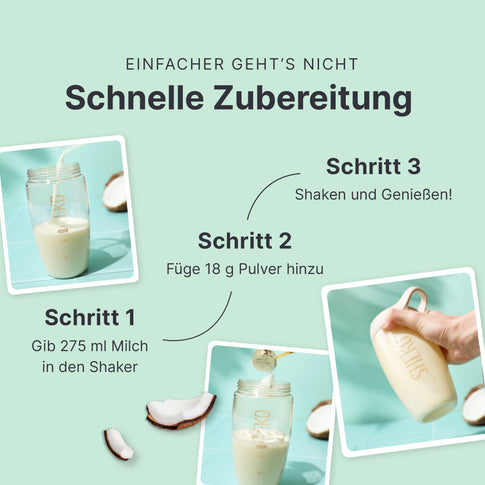Dein Shake ist in nur drei Schritten fertig: Gib 275 ml Milch (1,5 % Fett) in den Shaker. Füge 18 g Pulver (ca. 2 gehäufte EL oder 2 gestrichene Messlöffel) hinzu. Schüttle alles gut durch. Fertig zum Genießen!